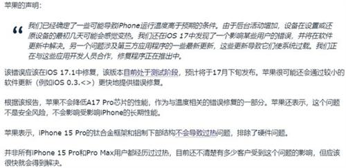 不过苹果方面表示,新手机过热的情况与钛合金边框无关,由于一些特定应用和iOS系统中的漏洞,导致这款手机在运行某应用时出现过热。针对这些问题公司已经和应用开发者达成了合作,将会在接下来的版本更新中解决这些问题。而且即将发布的ios17更新并不会对处理器性能做出限制,不会降低用户手机的设备性能。