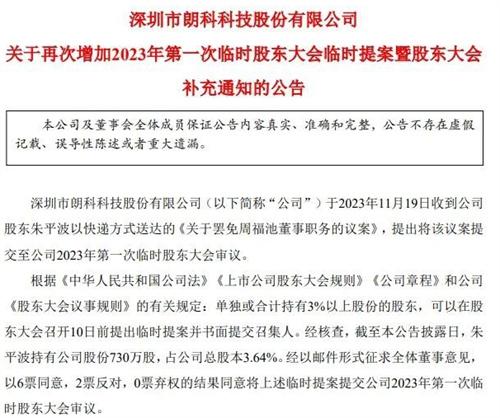 近日,朗科科技突然间发布一则公告称即将召开的临时股东大会将会增加一份临时提案,在朗科持股3.64%的新进股东朱平波在提案中建议罢免周福池董事职务,并且这份提案已经获得了董事会同意。而根据公开资料显示周福池从2021年9月开始一直到现在为止都在担任郎科科技董事长。根据公告显示,在征求全体公司董事会的意见之后,这份罢免提议以6票同意零票弃权两票反对的结果将会提交公司在2023年第1次临时股东大会中审议。这个即将召开的临时股东大会意味着该公司即将有一场大风暴到来。