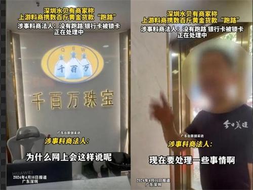 4月16日,社交媒体中传播一条“关于深圳市罗湖区水贝片区一家名为千百万珠宝商家‘跑路’”的消息,该消息表示“千百万珠宝”老板携带400公斤的黄金原料“跑路了”,涉及到的金额达到2亿元左右。